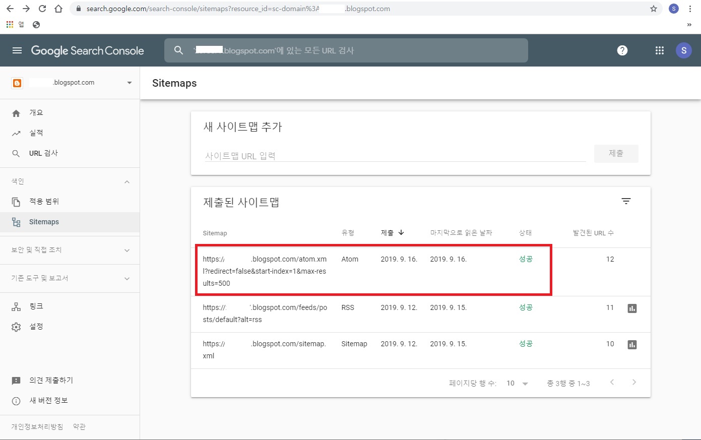 - 본인의 블로그주소 + "/atom.xml?redirect=false&start-index=1&max-results=500" 를 붙여서 입력하고 제출해 줍니다.