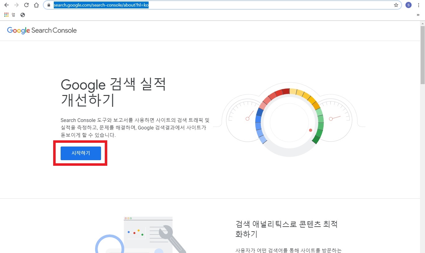 1. 구글 서치 콘솔(Google Search Console)에 접속하고 "시작하기"를 클릭합니다.