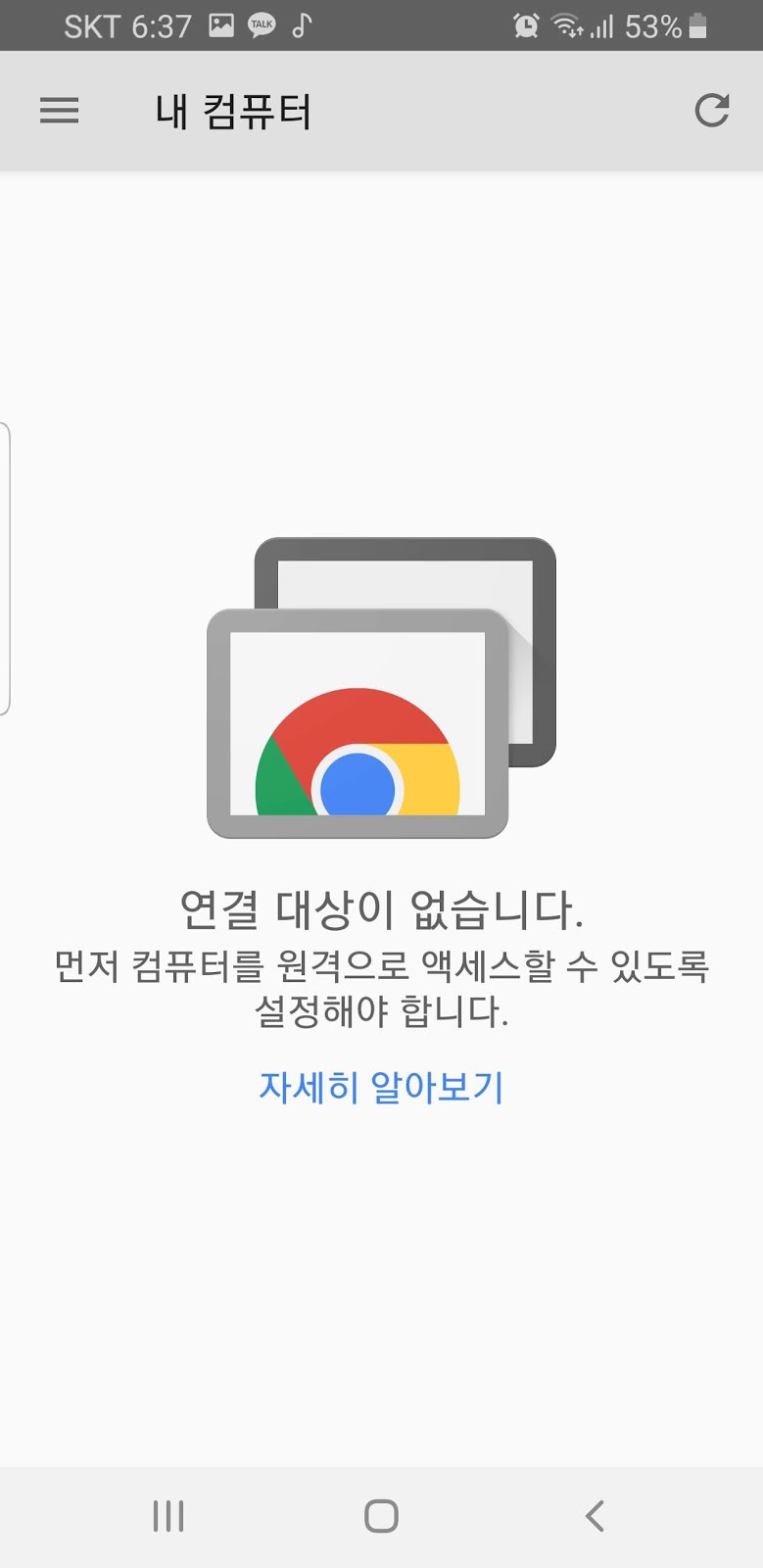 9. 혹시, 아래 처럼 연결 대상이 없다고 뜬다면, 현재 스마트폰의 구글 계정이 PC의 구글 계정과 동일한지 다시 한번 확인 바랍니다. PC에 로그인 된 구글 계정과 스마트폰에 로그인 된 구글 계정이 같아야 합니다.