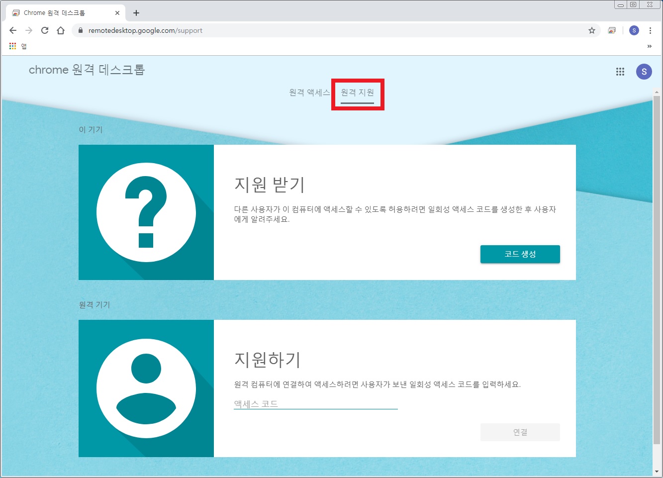 (원격 기기) 지원하기는 접속코드를 입력하고 해당 PC로 접속할 수 있는 기능입니다.