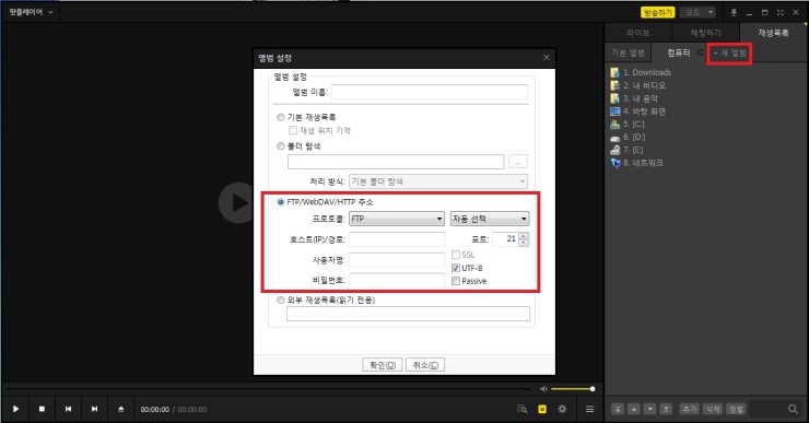 6. FTP/WebDAV/HTTP 주소 아래 부분에 세팅값 입력하고 "확인"을 눌러주세요.