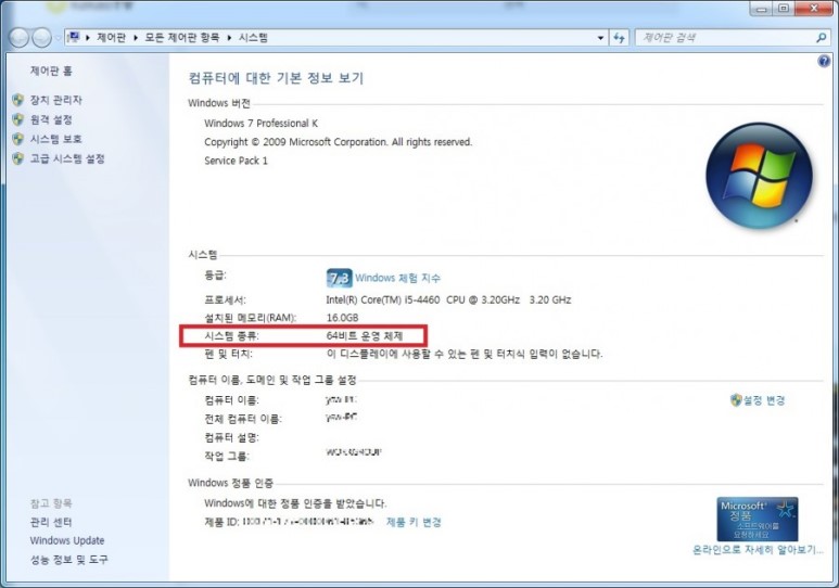1. 내 컴퓨터(우클릭) -> 속성에서 시스템 종류를 확인합니다.(전 64비트 운영 체제네요)